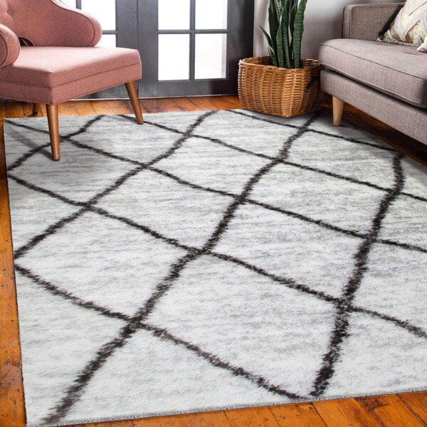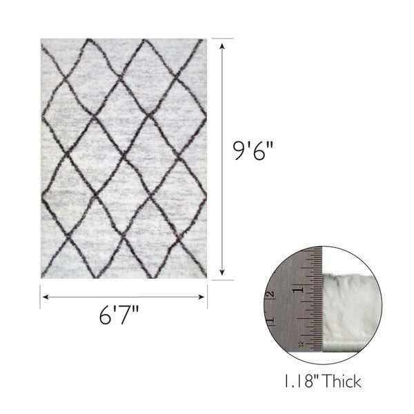 The Leick Home 594549 Ardita Rug offers a timeless look with its stylish Moroccan Diamond Trellis pattern. Its velvety soft texture adds visual interest as well as a sense of warmth and coziness to any space. The heathered gray background with charcoal detail makes it easy to style and lends a touch of luxury to modern and traditional surroundings alike making the perfect kids room rug. Non shedding, durable, easy to care for shag area rug measuring 6 Foot 7 Inch by 9 Foot 6 Inch. Crafted in Turkey.