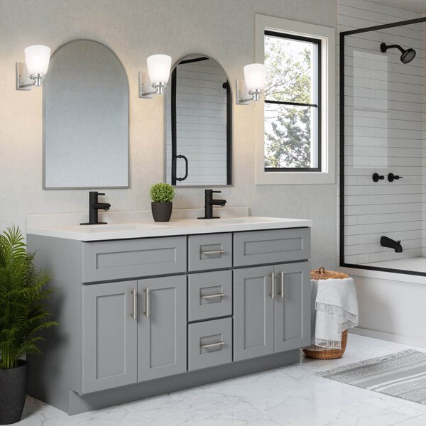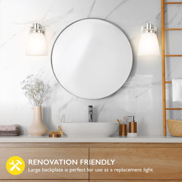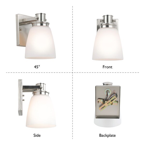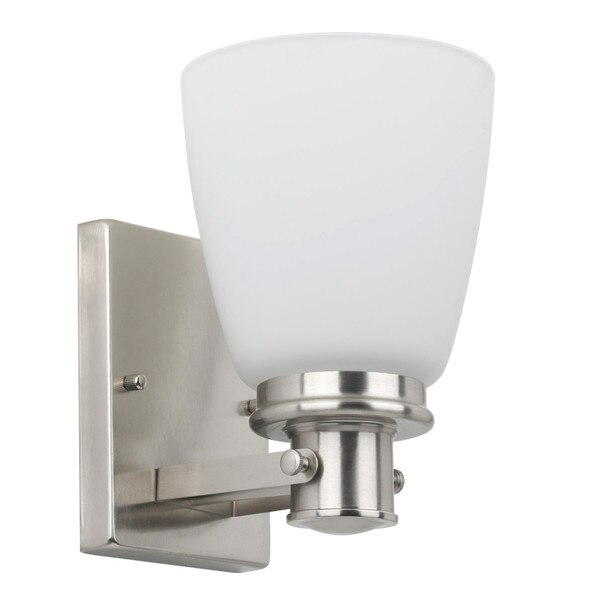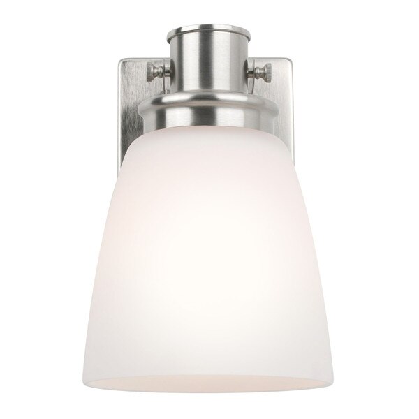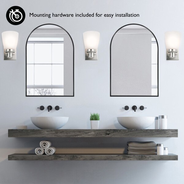 The Design House Atkinson Wall Light features an elegant satin nickel finish and bell-shaped frosted glass shades that create beautiful ambient lighting. This light fixture's simple and versatile design pairs well with all home decor styles, including traditional, modern, and industrial. Ideal for use in hallways, bedrooms, and bathrooms. Constructed of durable steel for long-lasting usage. This product is UL certified for use in damp locations. Dimmable when used with a compatible dimmer switch (not included). Uses one 60-watt medium base bulb or LED equivalent. Designed and manufactured by Design House, the trusted source for quality lighting, hardware, plumbing, kitchen, and bath products for every taste and budget.