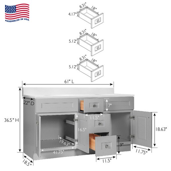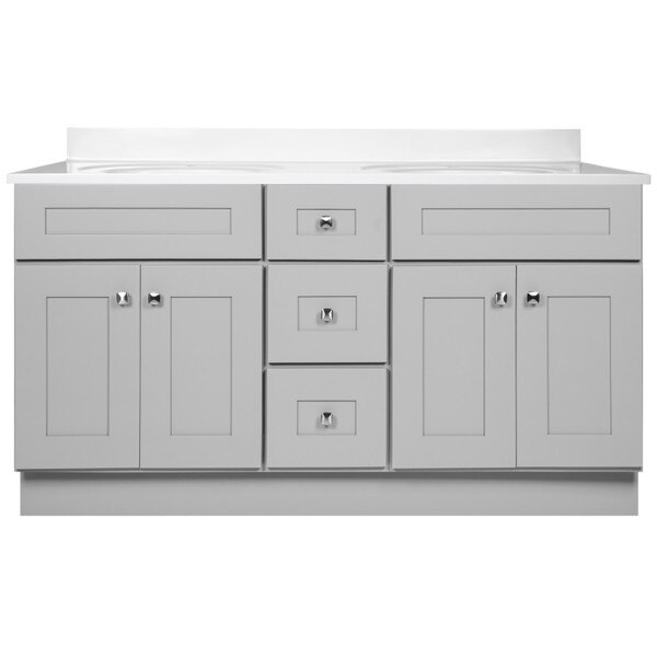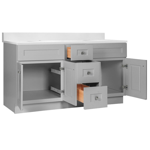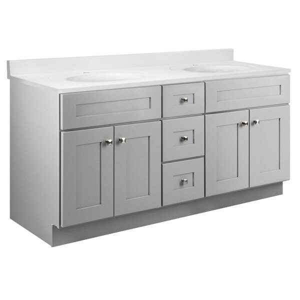 Elevate your bathroom's aesthetic with the Design House Brookings 61-inch bathroom vanity cabinet. Designed to effortlessly blend with any style, from rustic to modern, this cabinet features shaker styled door trim, plywood side and bottom panels, a solid wood face frame and a back panel for a seamless look. This vanity measures 61-inch W x 22-inch D x 36.5-inch H. The six-way adjustable soft-close hinges ensure quiet door operation, while the Sherwin Williams® Gray finish adds a touch of contemporary elegance. Optimized to fit your bathroom space, this 4-door and 3-drawer bathroom vanity with sink will store all your essentials and keep clutter out of sight. The double sink comes in a clean Solid White finish with overflow holes and a single hole for your faucet above two oval bowls. This top has an integrated backsplash that helps prevent water damage. This countertop's square edges add a modern design to appeal to contemporary tastes. This vanity cabinet is fully assembled for a hassle-free installation process. It is assembled in the USA and packaged with care. Manufactured by Design House, the trusted source for quality lighting, hardware, plumbing, kitchen, and bath products for every taste and budget.