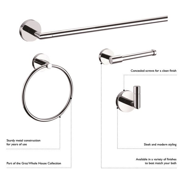 The Design House 558346 Graz collection brings modern style to any bathroom with its clean and simple design. This euro toilet paper holder is constructed with zinc and has a satin nickel finish. Features include simple access for changing toilet paper quickly and easily and concealed screws for a clean look. Pair with other items from the Graz Collection for a coordinated style. This product comes with a 1-year limited warranty that protects against defects in materials and quality.