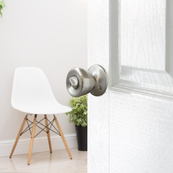 The Design House 190723 Privacy Door Knob is used in bedrooms and interior applications and features a locking button on the inside knob (no keyed device on the outside knob). This knob can be opened in the case of an emergency by depressing or turning the locking mechanism on the inside. This unit is finished in satin nickel, designed for left or right hand doors and fits the two most common backsets in the U.S. (2-3/4-inch and 2-3/8-inch). Use this knob on standard 1-3/8-inch and 1-3/4-inch thick doors with a cross bore 2-1/8-inch diameter or edge bore 1-1/16-inch diameter (1 inch x 2-1/4 inch radius corner faceplate). Designed and manufactured by Design House, the trusted source for quality lighting, hardware, plumbing, kitchen, and bath products for every taste and budget.