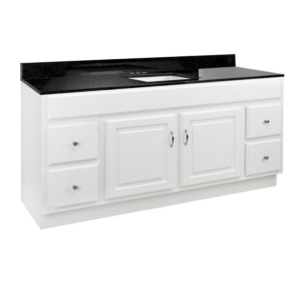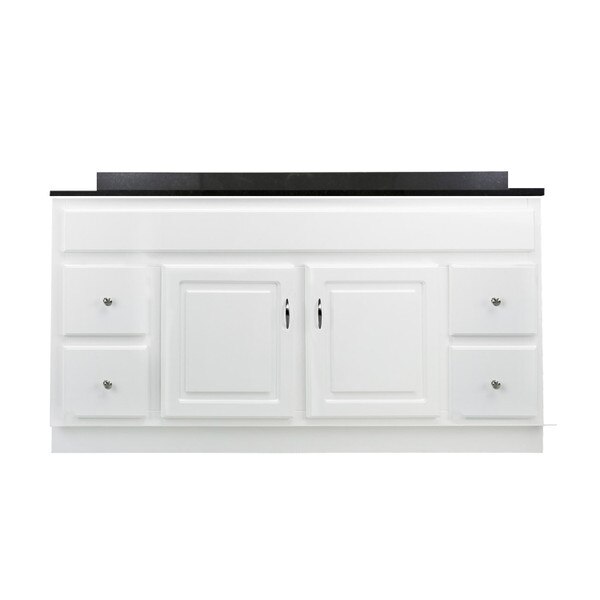 Give your bathroom a boost of elegance with the Design House 592725 61-inch Concord bathroom vanity set. Modern design meets traditional charm, this piece offers clean lines and a durable white gloss finish. Features include 4 fully functional drawers (two on each side) with easy glide drawer hardware and 2 doors that conceal generous interior space, perfect for storing toiletries, cleaning supplies, and more. The Concord vanity is stylishly paired with a sleek Black Pearl granite top creating a dramatic contrast with the crisp white base. A rectangular, white ceramic undermount bowl sits flush inside. One overflow hole and three 4-inch straight holes are pre-drilled to install your faucet and a backsplash is included to help prevent water damage. This countertopfoots squared edges add a modern design to appeal to contemporary tastes. The vanity base measures 60 inches by 21 inches and comes unassembled with satin nickel hardware included. The Design House 61-inch Concord bathroom vanity set has a 1-year limited warranty that protects against defects in materials and workmanship.