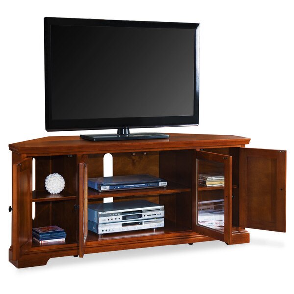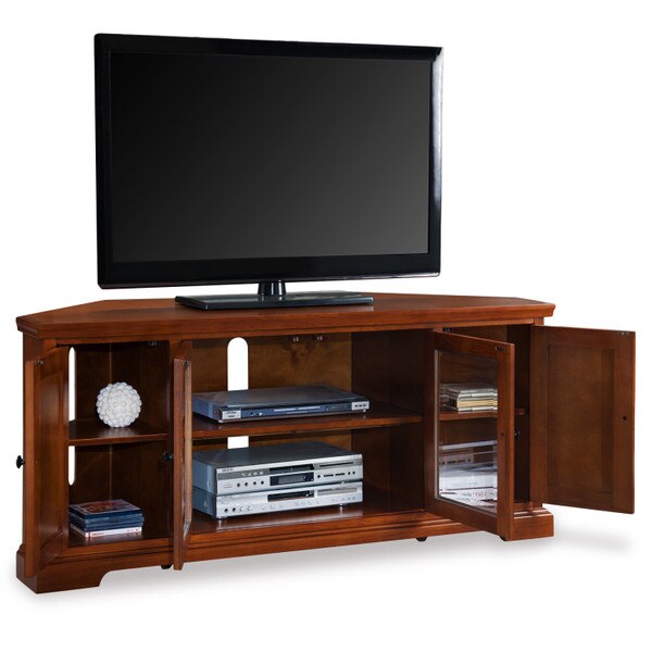 The Westwood Cherry 60inch TV Corner Console with Storage provides a fashionable home for TVs up to 60inch with its rich, westwood cherry finish and classic, raised panel design. Storage opportunities abound with adjustable shelves behind the tempered glass doors and media cabinets for enhanced flexibility. Constructed of solid wood and wood veneers this TV stands features include cord management slots in the back, blackened hardware, and sturdy cabinets that will tidy up and store things out of view. Designed and manufactured by Leick Home, the trusted source for quality home furnishings for every taste and budget.